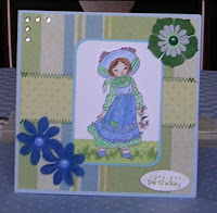 A Spoonful of Sugar's challenge this week is to make something with the colours Blue and Green. At first I was really stumped as it is not often I use these colours together. Anyway, I had a think about it, looked in my small stash of papers and I found a couple of sheets of K & Co papers I had bought at some time. Great, I had the start of my card. I have used a stamp from Whiff of Joy called Willow with Sunhat. This stamped image was sent to me by someone on UKS. I love this and must get the stamp.